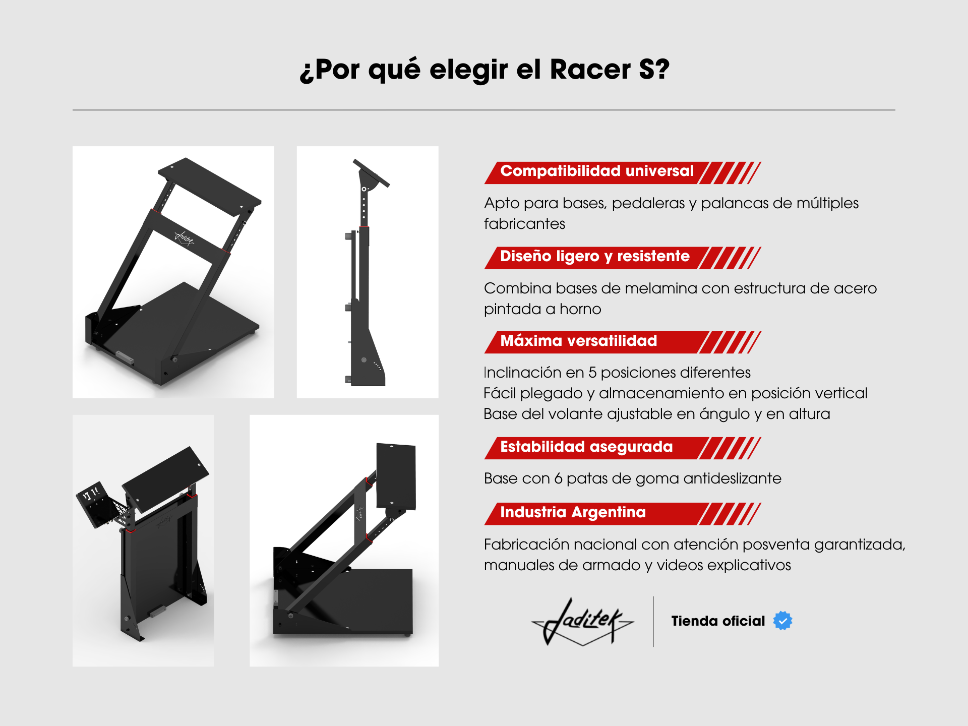 Tanto la base inferior como la base superior están fabricadas en madera con melamina negra de excelente terminación, y se adaptan a cualquier tipo de volante y pedalera. La base inferior posee un tope de goma en su parte posterior para evitar el deslizamiento de la pedalera.